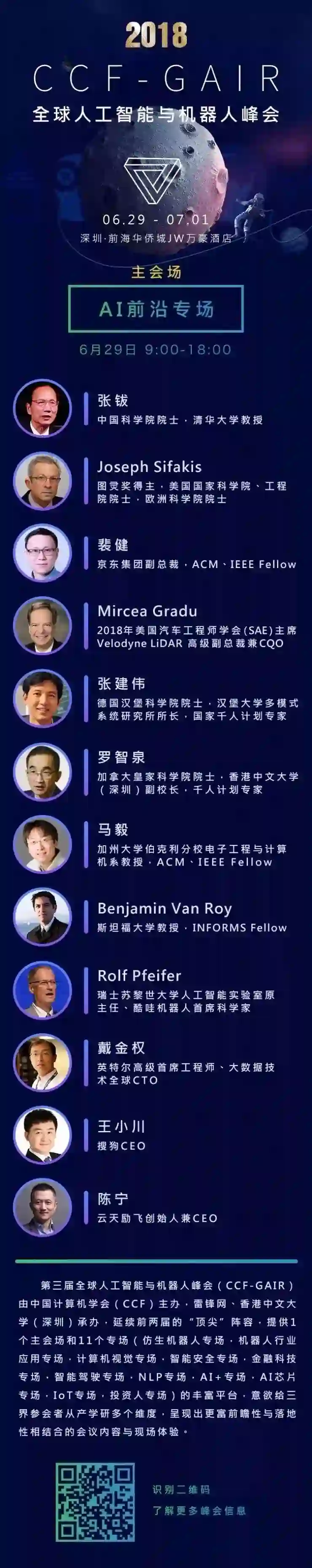 离6月29日开幕的第三届CCF-GAIR全球人工智能与机器人峰会,不到一个月的时间。主办方中国计算机学会(CCF)和承办方雷锋网、香港中文大学(深圳)正式公布大会首日的演讲嘉宾名单。