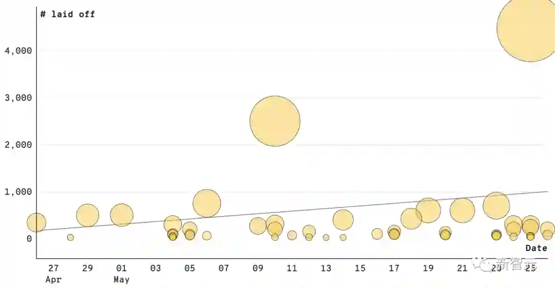 过去一个月以来全球科技初创公司的裁员,圆圈大小代表裁员人数