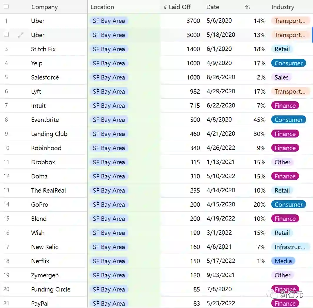 另外,登上这个裁员榜大公司还包括餐饮共享服务商Yelp(裁员1000人)、云计算巨头Salesforce(裁员1000人)、共享汽车公司Lyft(裁员982人)、在线媒体服务商Netflix(裁员175人)、移动支付巨头Paypal(裁员83人)等。