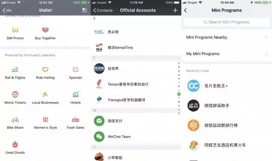 微信还推出了一个“小程序”的部分,一个基于API的生态系统,允许第三方开发人员在主要的微信应用中创建“子应用”,这样用户就不必离开微信本身了。第三方开发者的应用可以无缝连接到用户现有微信帐户的支付和社交功能。