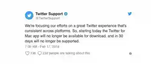 据消息了解,国外社交网络服务推特发布公告称:"将停止支持Twitter for Mac应用,公司将重新专注于"跨平台一致的优秀Twitter体验",而不是继续开发Twitter for Mac,从今天开始,Mac版的Twitter将不再可供下载,并且在30天内将不再被支持。"推特还表示,如果用户想要在Mac平台上享受完整的推特体验,可以访问网页版推特。