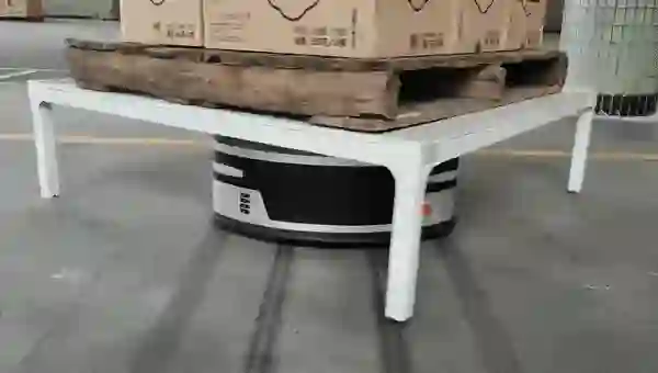 这些机器人可以自由的在货架下面游荡,背起货物行走,或是放下。