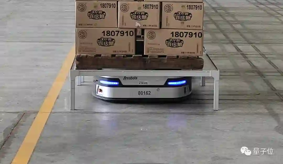 虽然机器人藏在货物架下面,但仔细找还是可以看到Aresbots的logo,就是旷视2018年全资收购的艾瑞思机器人。