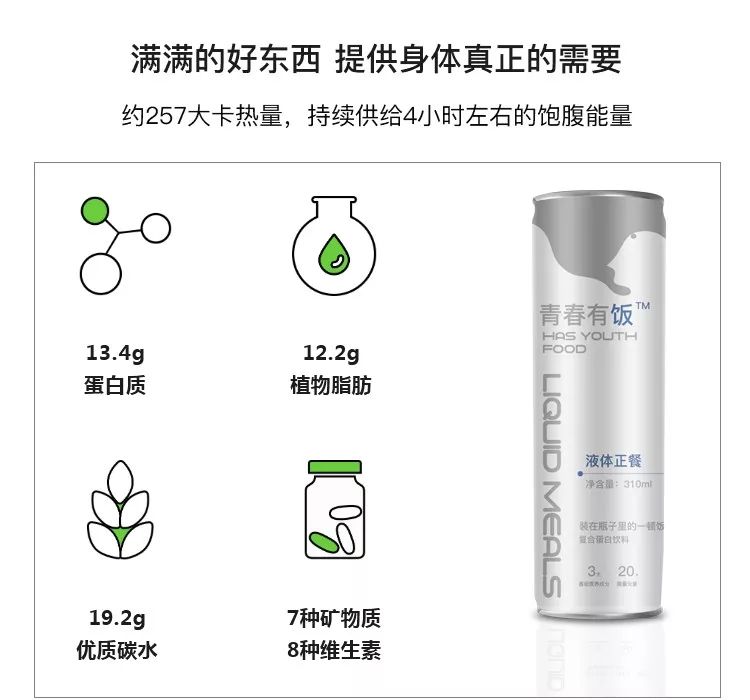 青春有饭液体正餐,每一瓶310ml,可提供蛋白质13.4克、脂肪12.2克、碳水化合物19.2克、膳食纤维9.6克,主要来自燕麦粉、牛奶蛋白、大豆蛋白、椰子油和麦芽糊精。除了这些每餐必需的营养成分之外还有足量的维生素A、维生素B、维生素C、维生素D、维生素E以及钙、镁、锌、铁等矿物质,充分满足了对日常饮食的营养要求。