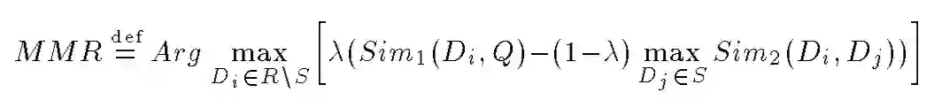 MMR算法最早在SIGIR1998上面被用户搜索领域,其从所有候选文档中逐个选择文档放入结果列表中,选择文档是同时考虑了文档与搜索内容的匹配程度和此文档与结果列表中其他文档之间的最大相似度。具体来说,其将文档与搜索的相关性与文档之间的相似性以一定的权重相减作为目标函数,每次贪心的选择目标函数值最大的文档加入结果中,以实现在搜索结果中增加多样性的目的。
