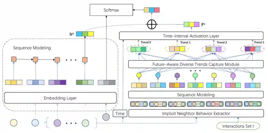 本文来自于腾讯核浙江大学,提出了一种用于增强序列化推荐模型多样性的框架(FAT)。对于一个用户的行为序列,首先使用序列模型(LSTM)获取到当前用户的兴趣,再将当前用户的打分向量与其他所有用户打分向量计算皮尔森系数作为用户之间的相似度信息,再根据此相似度选择一些邻居用户,从邻居用户的交互中选择时间大于当前时间的未来交互序列并同样使用序列模型得到特征,再通过一个考虑时间信息的注意力层得到未来的趋势信息,与当前用户的序列特征一同用于推荐。