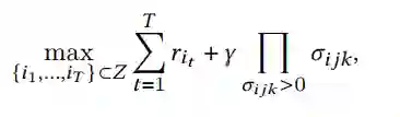 本文同样来自阿里-南阳理工大学团队,其针对交互推荐的场景提出了一种集合模函数和分布函数的多臂老虎机框架。其分别定义了评价一个推荐结果相关性的模长函数和评价结果多样新的分布函数,并推导出二者在单词决策下的反馈变化,将推荐集合的生成建模为一个多步骤的决策过程,以使用强化学习的策略最大化累计奖励,最终实现推荐的商品集合在贪心情况下满足相关性和多样性的最大化。同时其理论证明了其优化策略可以在有限轮的学习下达到最优的累计奖励。