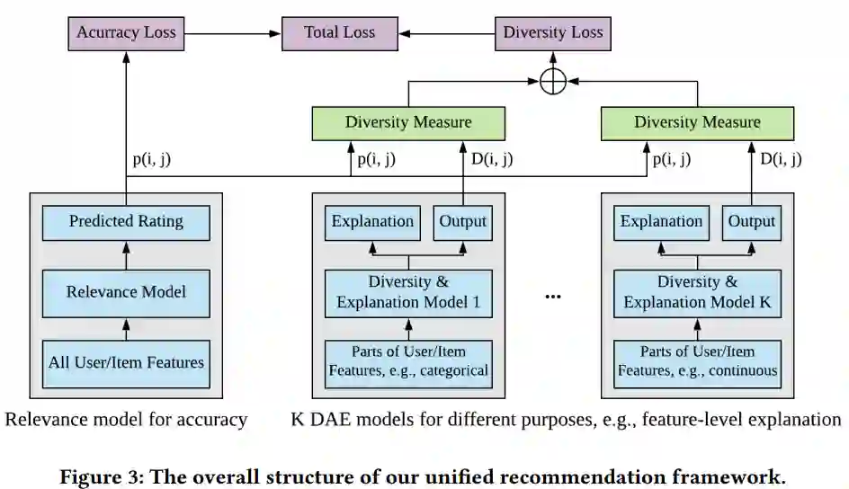 本文来自Salesforce团队,针对企业场景下的APP推荐问题,提出了一个保证结果的多样性和可解释性的框架。其使将用户在所有商品上的分布简化为一个高斯分布,通过KL散度限制每个用户对应高斯分布与标准高斯分布之间的距离,同时使用多个平行的模块处理不同的特征组合,将输出作为推荐结果在特征层面的解释,最后通过在最终loss中平衡准确度目标和分布距离目标来实现对多样性的保证。