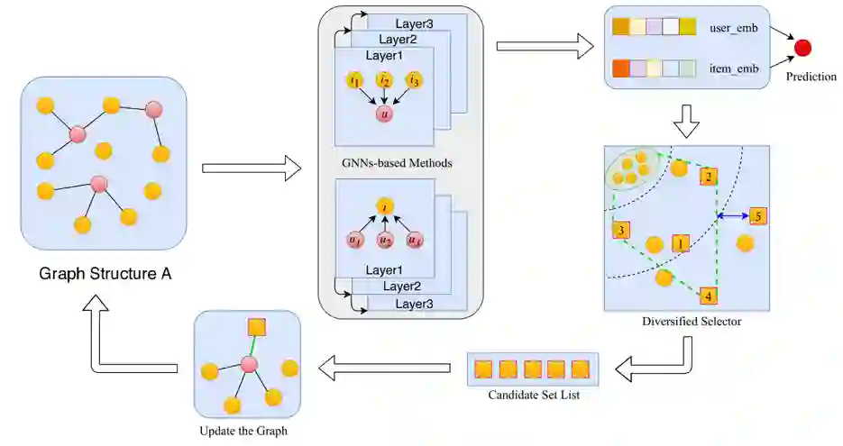 本文来自于美团,提出了一种动态图构建的方法用于提高推荐多样性。现有的基于GNN的推荐模型大都采样一阶邻居聚合的方法进行端到端的训练,但是这种GNN结构会使得占据主导地位的节点特征淹没长尾节点的特征。为了解决这个问题,其将端到端的训练过程进行多轮迭代,每一次都为图结构增加一些新的边,以此希望能够缓解邻居聚合时的特征分布偏差。在添加新边时,为每一个用户节点贪心的选择新的邻居商品集合,在选择时同时考虑了商品与用户的匹配程度和商品与已有邻居之间的距离,力求新加入的商品尽量多样。其本质上还是通过发掘潜在的多样交互以丰富用户数据。