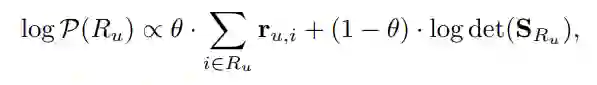 MMR算法中的目标函数只考虑了商品间的二元相似性,这与推荐商品集合的整体相似性还存在一定的偏差。为了解决这个问题,DDP算法在2018年的NIPS上被应用到多样化推荐领域。其在推荐商品集合上定义了一个核矩阵,核矩阵的行列式便同时考虑了所有商品的相关得分和整体的相似度,并且构建这个核矩阵也可以通过贪心法逐个选择目标函数值最大的商品,同时通过最大化后验推断的方法,这个构建过程可以极大的加速。并且此方法可以天然的使用商品嵌入向量计算商品间的相似的,所以在多样化推荐的研究中有大量基于DDP的变种方法,后续的介绍中我们也可以看到其最新的应用。