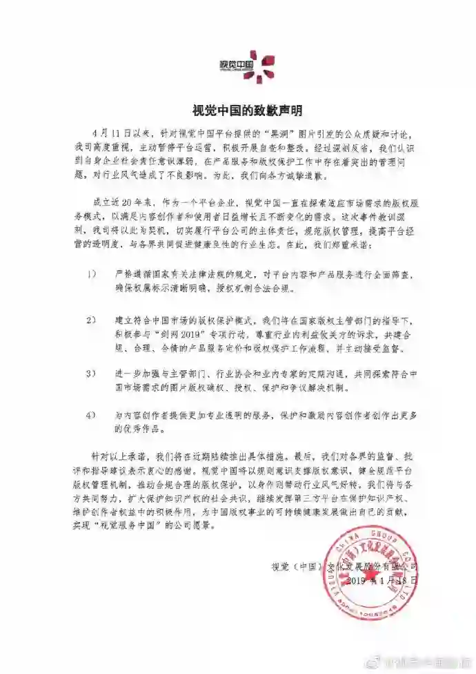 视觉中国在其官微发布致歉声明,针对视觉中国平台提供的“黑洞”图片引发的公众质疑和讨论,我司高度重视,主动暂停平台运营,积极开展自查和整改。承诺建立符合中国市场的版权保护模式。