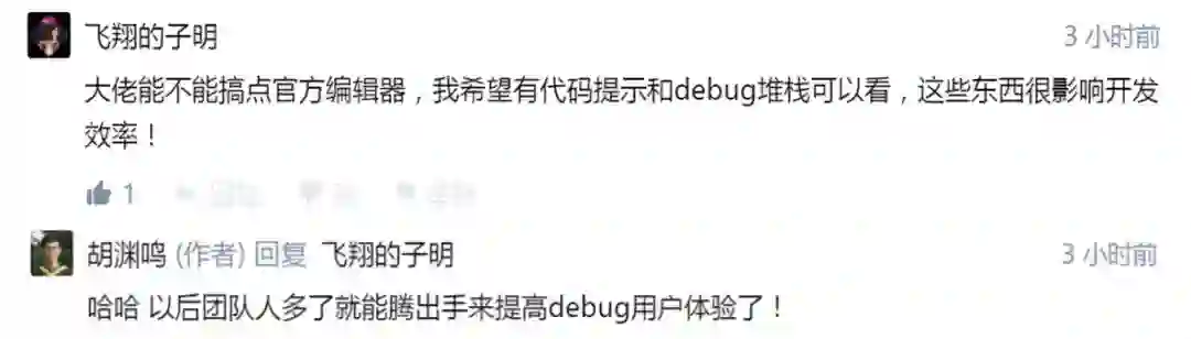 对于网友关心的官方编辑器以及代码提升和 debug 堆栈等技术细节,胡渊鸣表示,以后团队壮大后将致力于提高 debug 用户体验。