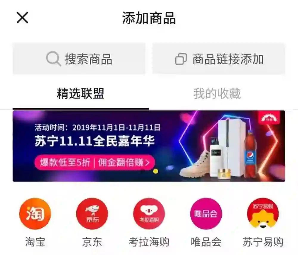 抖音商家可以通过抖音的精选联盟去添加商品,精选联盟主要和淘宝、京东、考拉海购、唯品会、苏宁易购这5个电商网站相关联。