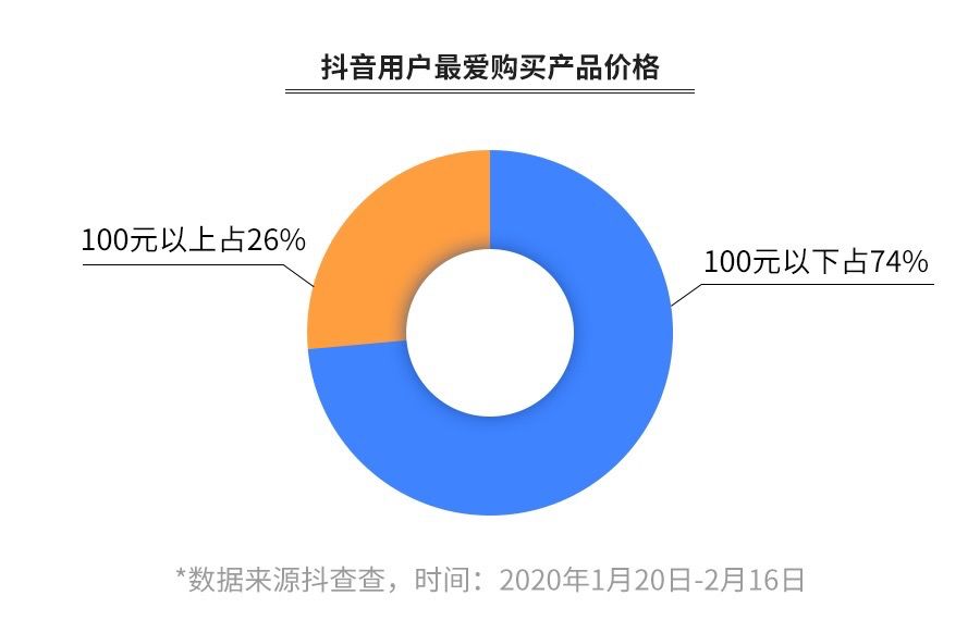 根据抖查查近一月的数据显示,用户在购买产品的时候,74%的用户会选择100元以下的产品,而且排名前10的产品大都是在70元以下,比如最近一周的热销产品,价格基本都在50元以下。