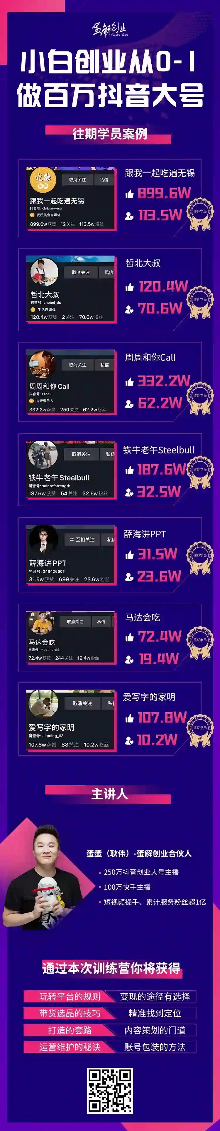 本次训练营将提供给你一套完整的从0—1做百万抖音大号的体系,无论你是兼职搞直播带货的上班族、短视频小白创业者还是线下转线上的企业老板,都能帮助你学会: