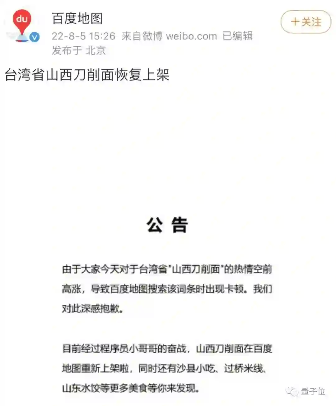前几天,由于地图软件可显示台湾省的每个街道了,大量网友涌入百度地图搜索“台湾省山西刀削面”,导致百度地图被搜崩了。(手动狗头)