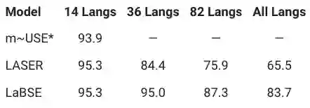 下表列出了与每种语言组的m〜USE、LASER以及LaBSE模型实现的平均准确性对比结果。