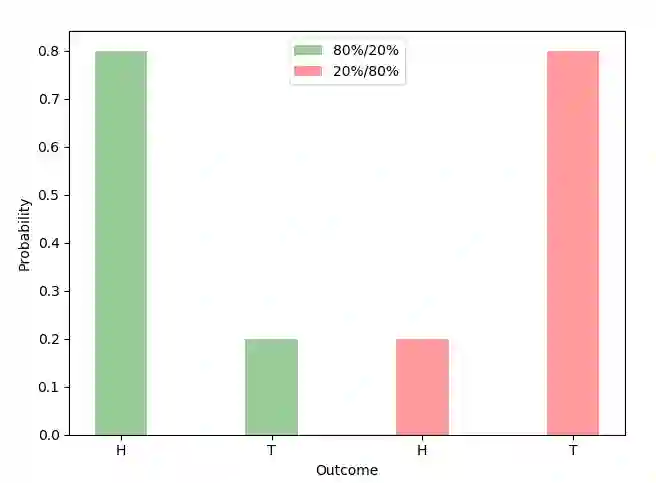 考虑两个特殊的硬币,第一个硬币正面朝上 (H, Head) 的概率为80%,背面朝上 (T, Tail) 的概率为 20%。另一个硬币的正面朝上和反面朝上的概率分别为 60% 和 40%。如果我们同事抛两枚硬币,那么有四种可能:正正,正反,反正,反反。对应的概率分别为[0.48, 0.32, 0.12, 0.08]。