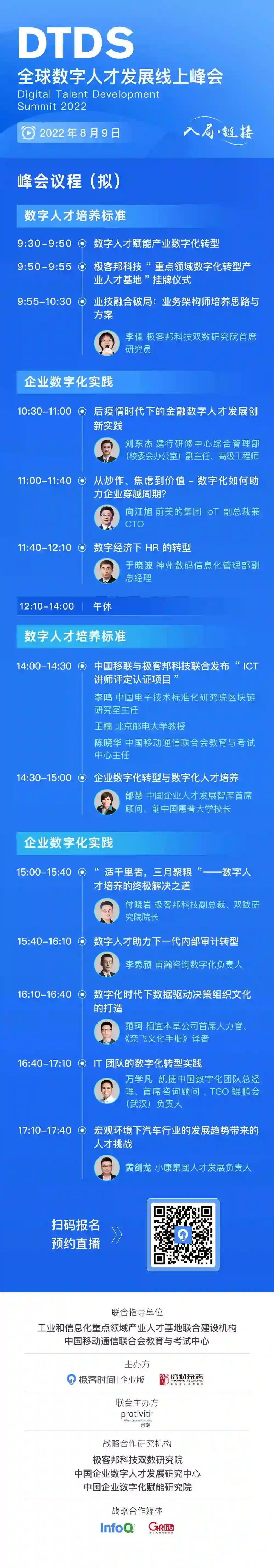 8 月 9 日,DTDS 全球数字人才发展线上峰会 邀请政府和产业的权威,金融、汽车、制造、ICT、零售、互联网、风控审计企业的数字化负责人,IT 团队管理者,数字化组织和人才发展专家同台交流,从多维视角分享数字化先行者如何通过人才数字能力转型应对组织转型、业务转型、技术转型带来的考验。您将收获: