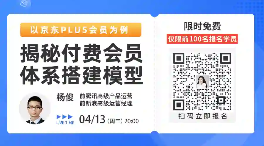 4月13日(周三)晚8点,前腾讯高级产品运营@杨俊老师,将会拆解京东PLUS会员背后的运营增长逻辑,教你会员权益搭建的方法!