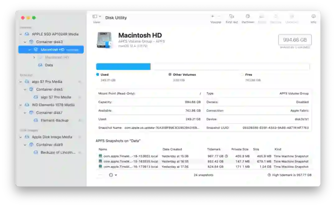此前,查看 APFS 快照的方式对于小白来讲很不友好,需要要去终端中,通过输入命令的方式才能看到。现在 macOS 提供了更为简单的方法,而且也可以显示出更多的参数信息。