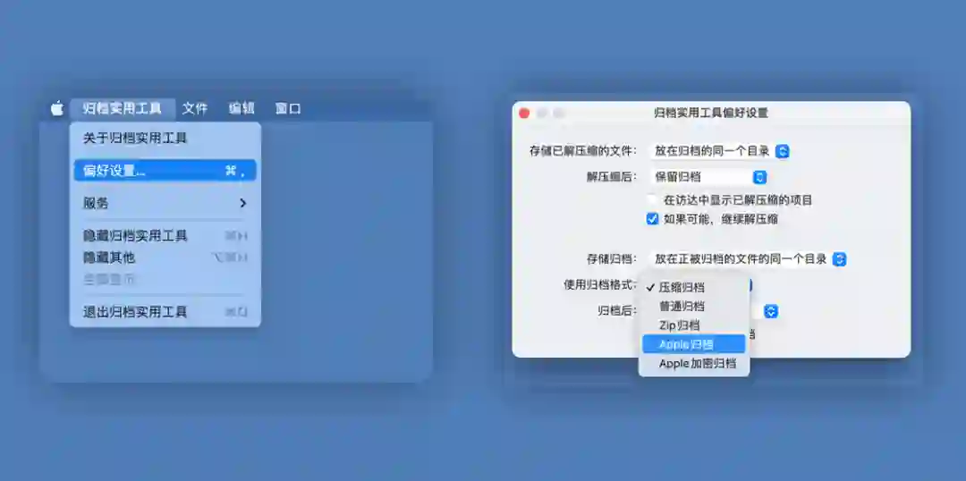 使用方法:Command ⌘ +空格键唤出聚焦搜索,然后输入归档实用工具,回车,打开归档使用工具。接下来在该 App 的偏好设置中进行相应的设置。偏好设置 > 使用归档格式 > Apple 归档。这样就可以使用 macOS 独有的压缩格式了。使用时需要在归档实用工具 > 文件 > 创建归档中进行,或者将文件夹拖到 dock 的图标上。