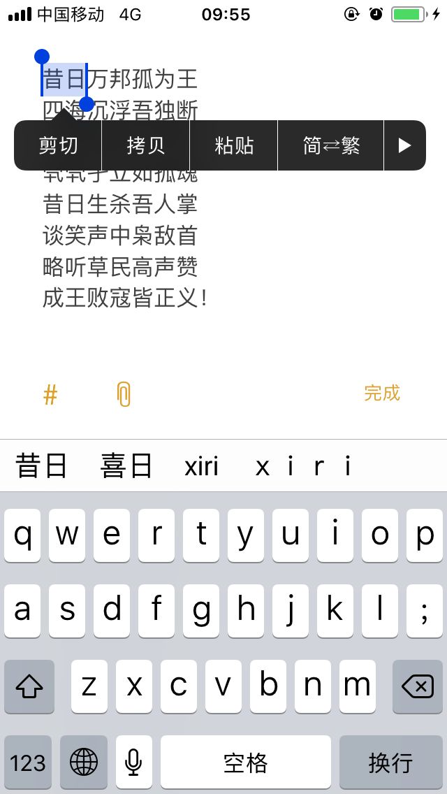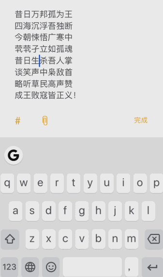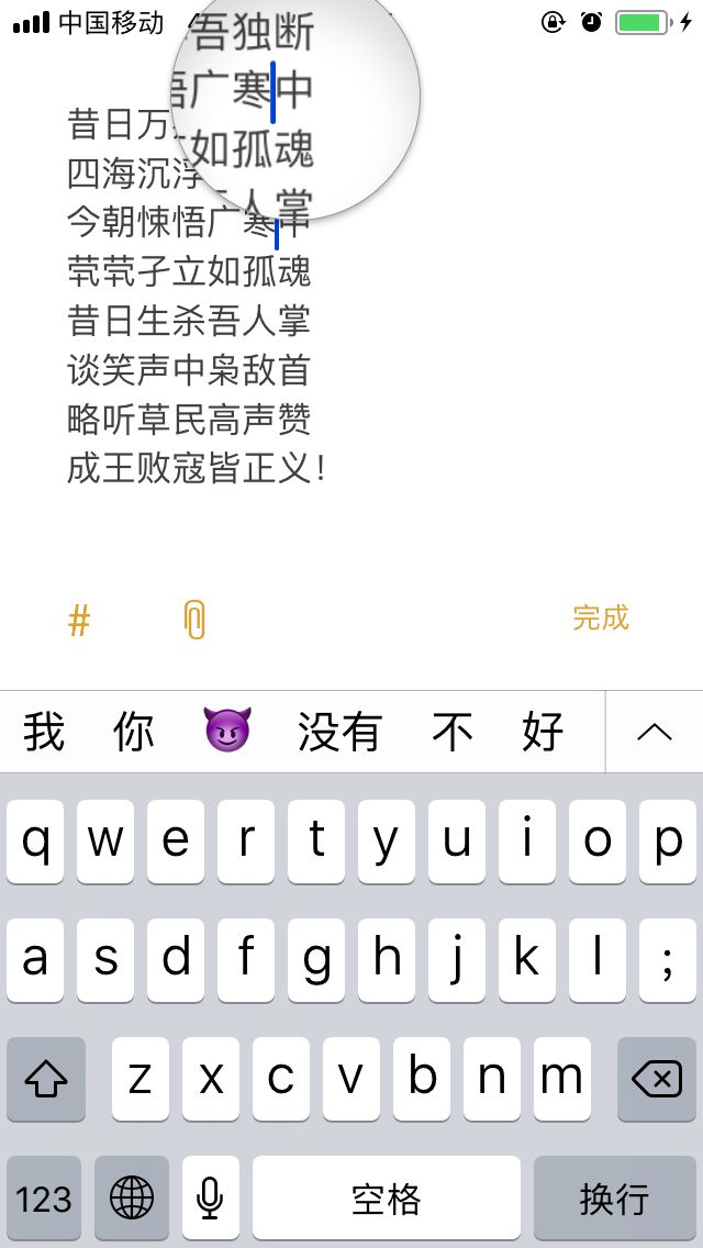 原生输入法毋庸置疑地提供了最佳方案:3D Touch 按压移动光标,可以小范围精确移动,也能一下纵跃十几行文字快速定位,就像使用 MacBook 的触摸板一样指哪打哪,精准高效。在编辑器里我喜欢哗——的一下跳到段首段末,而日常聊天时则小步移动。
