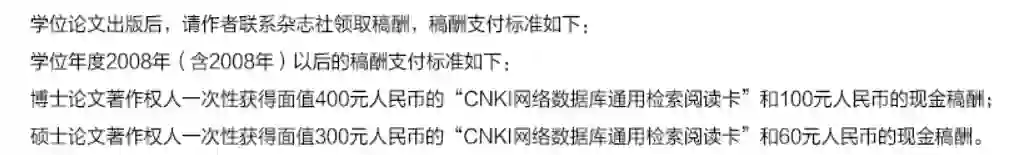 2019 年,《法制日报》曾对知网「低买高卖的模式」进行过报道,指出知网在原创作品支付报酬方面存在着不合理的地方。根据知网的《关于向中国学术期刊(光盘版)电子杂志社领取学位论文稿酬的通告》,学位论文出版后,博士论文著作权人一次性获得价值 400 元人民币的「CNKI 网络数据库通用检索阅读卡」和 100 元人民币的现金稿酬;硕士论文著作权人一次性获得价值 300 元人民币的「CNKI 网络数据库通用检索阅读卡」和 60 元人民币现金稿酬(这一标准至今未变)。