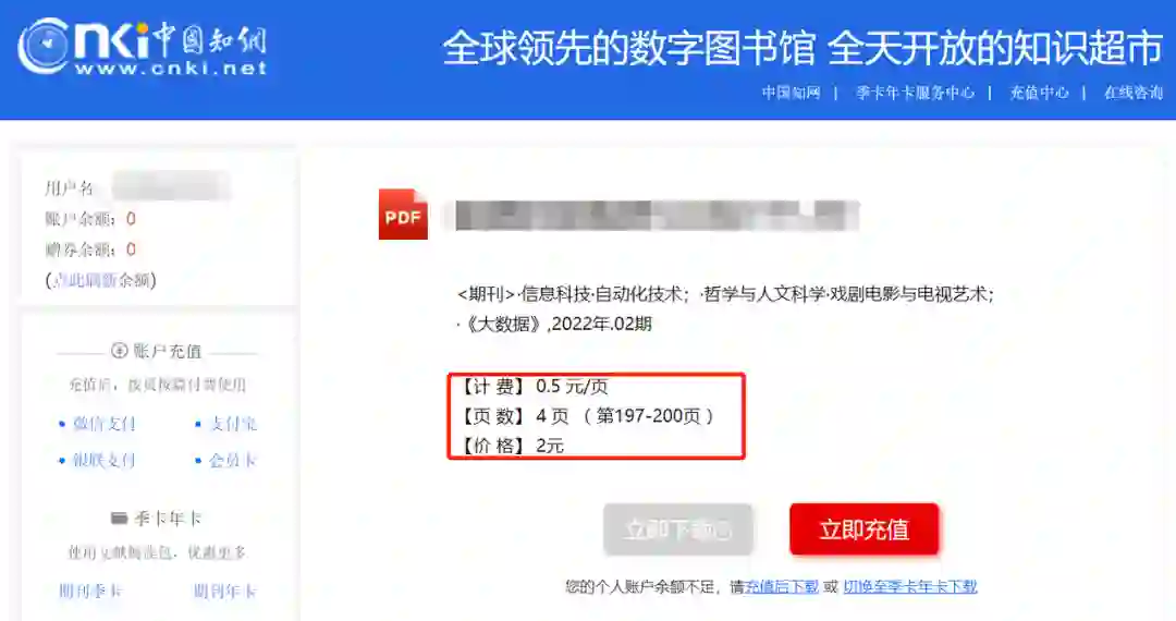 现在我们打开知网论文下载页面,页面显示 0.5 元 / 页,占据四页篇幅的论文就需要 2 元。但对于科研论文来说,参考论文也不仅仅只有一篇,论文页数远大于 4,这个花费可想而知。