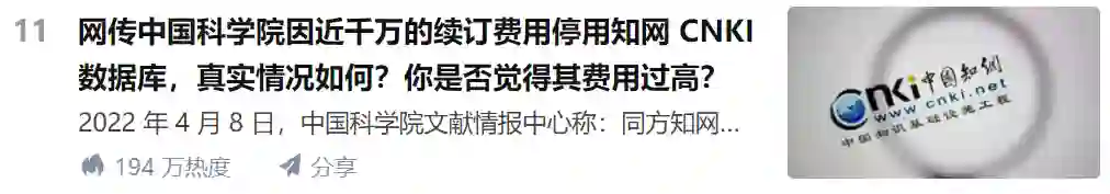 说到中国知网,在校学生想的第一件事就是找论文、查重,走到工作岗位想到的第一件事就是太贵!面对知网收费这个问题,不但个人觉得头疼,研究机构更是如此。近日,知乎一则帖子登上热搜榜,帖子内容为「网传中国科学院因近千万的续订费用停用知网 CNKI 数据库,真实性如何?」