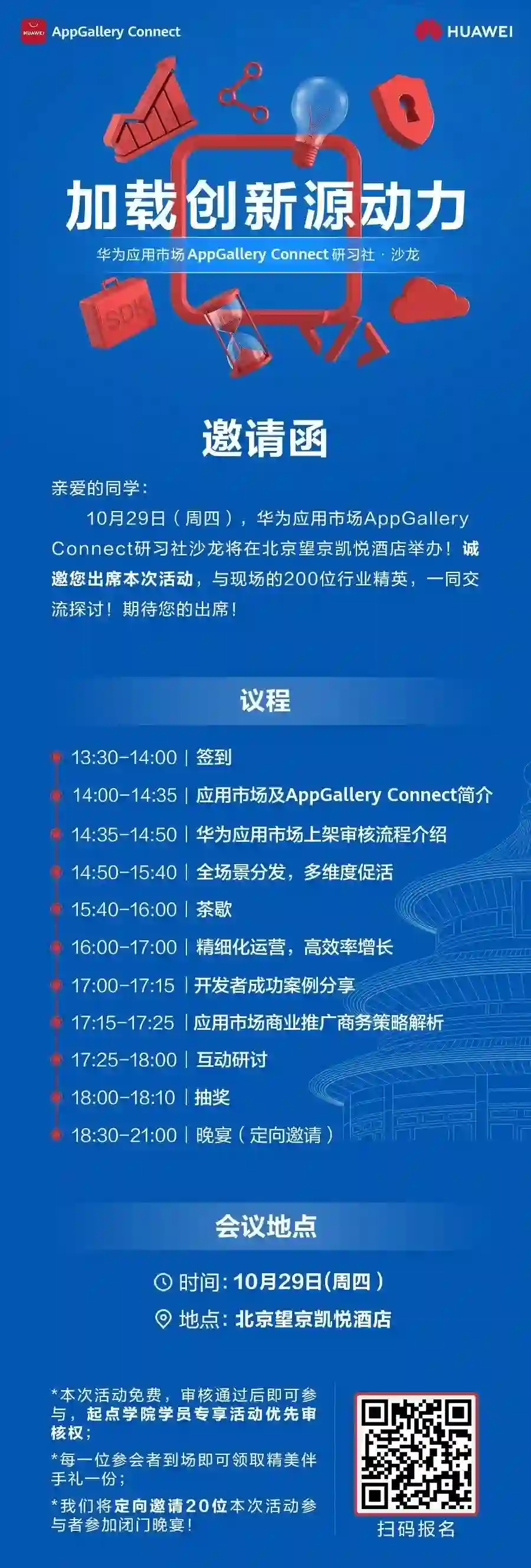 10月29日(周四),华为应用市场AppGallery Connect研习社沙龙将在北京举办。本次沙龙将重点分享华为应用市场审核政策、AppGallery Connect分发服务、精细化运营服务、商业推广商务策略等内容,为企业和开发者、产品、运营人员带来更多的解决办法。