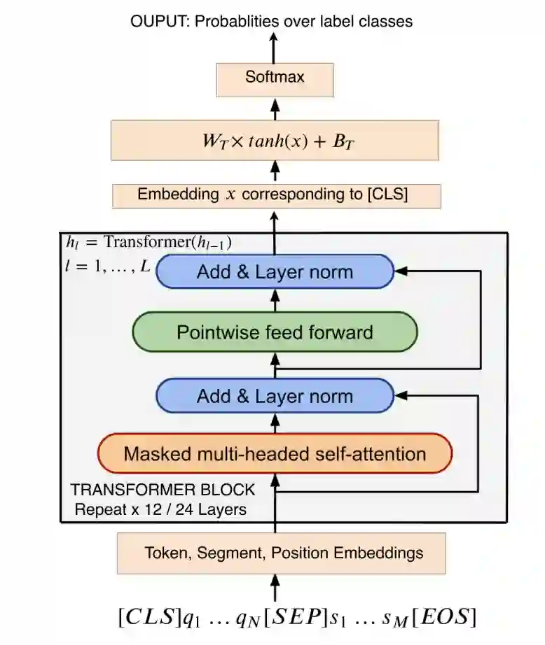 变压器模型的目的是捕获单词间的依赖关系,下图为文本对分类任务的变压器模型架构: