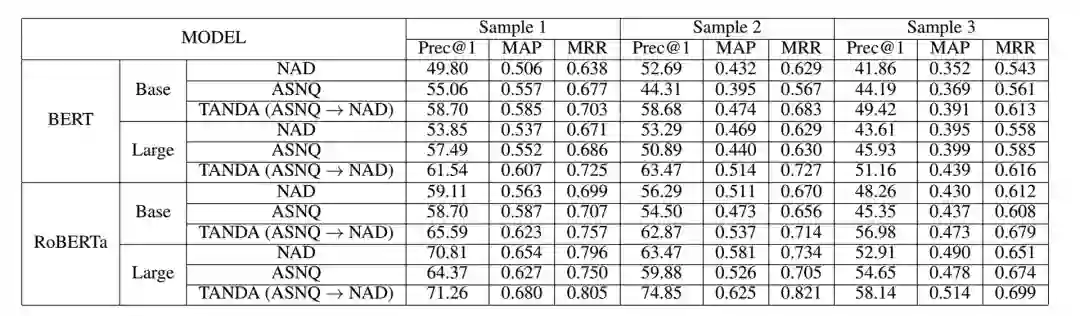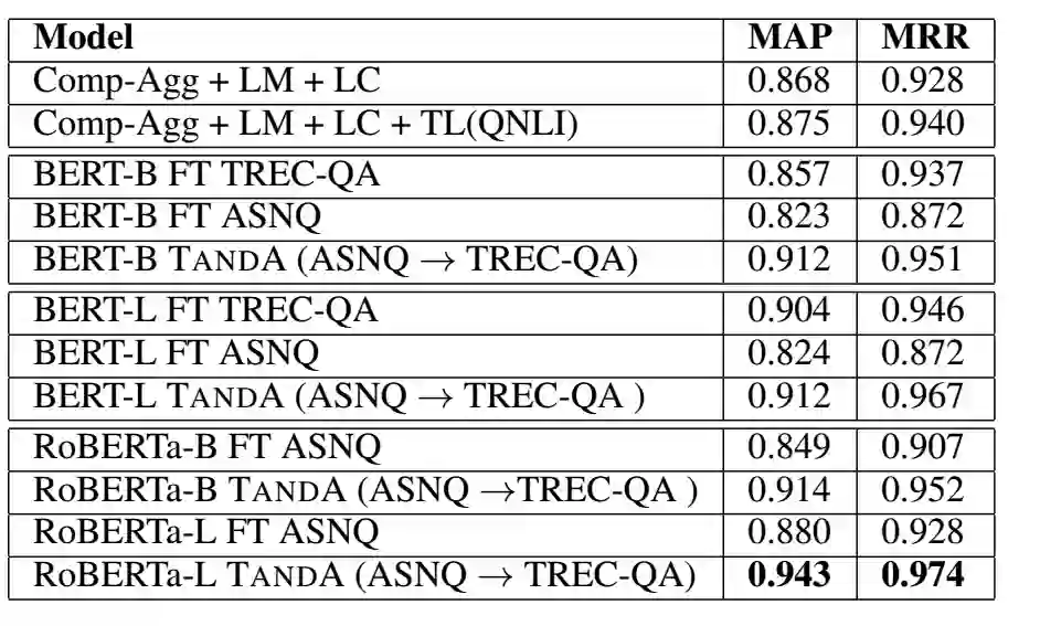 本文的工作将经典的精调(fine-tuning)过程拆成了两次,其中一次针对通用数据集,另一次针对目标数据集,此外,还专门构建了适用于AS2任务的通用数据集ASNQ。本文在两个著名的实验基准库:WikiQA和TREC-QA上进行实验,分别达到了 92% 和 94.3% 的 MAP 分数,超过了近期获得的 83.4% 和 87.5% 的最高分数。本文还讨论了 TANDA 在受不同类型噪声影响的 Alexa 特定数据集中的实验,确认了 TANDA 在工业环境中的有效性。