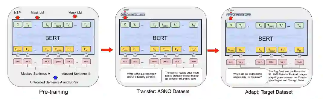 首先,使用 AS2 的大型通用数据集完成标准的精调处理。这个步骤应该将语言模型迁移到具体的 AS2 任务。由于目标域的特殊性(AS2),所得到的模型在目标域的数据上无法达到最佳性能,此时采用第二个精调步骤使分类器适应目标域。