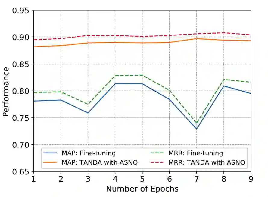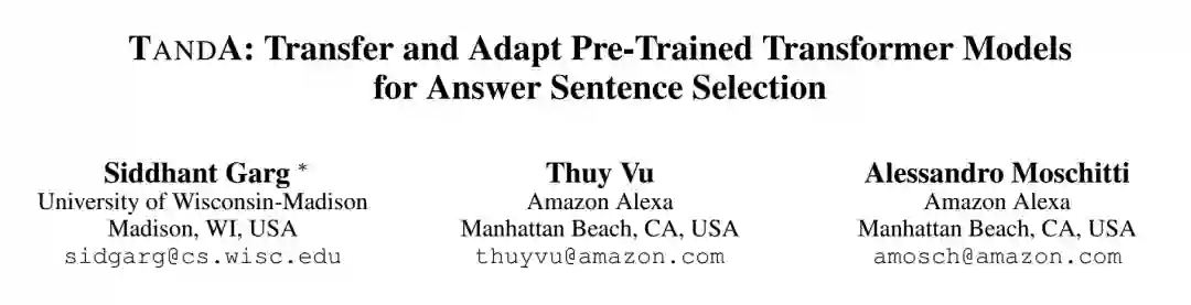本文提出了一种用于自然语言任务的预训练变换模型精调的有效技术-TANDA( Transfer AND Adapt)。首先通过使用一个大而高质量的数据集对模型进行精调,将一个预先训练的模型转换为一个用于一般任务的模型。然后,执行第二个精调步骤,以使传输的模型适应目标域