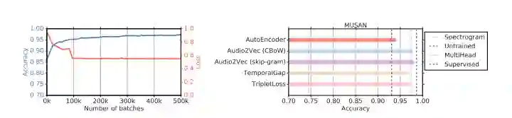 基于可能部署在移动设备上的小型编码器架构,研究人员证明,Audio2Vec和TAemporalGap能够生成可重复用于各种下游任务(如语音、音乐检测、扬声器识别和语言识别等)的表示,而无需在训练工程中使用有标记数据集。