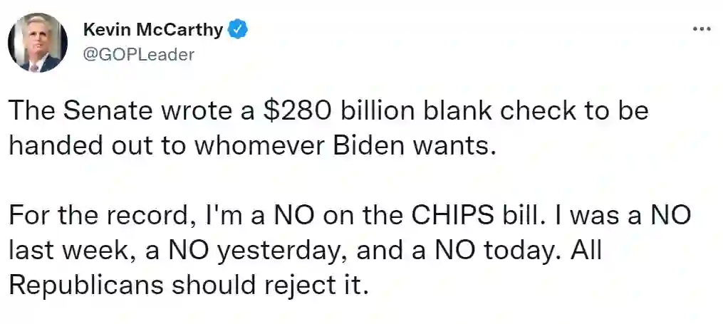 另外,他还认为,在两党商谈妥协的过程中,民主党在法案中塞进了太多与芯片产业激励无关的内容。
