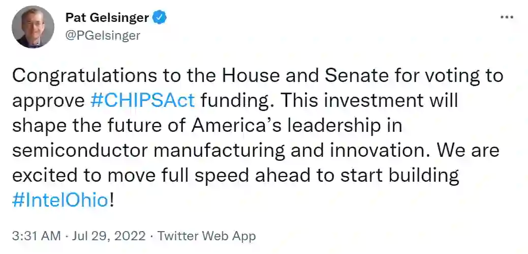 「祝贺众议院和参议院投票批准CHIPS法案的资金,」英特尔首席执行官Pat Gelsinger在投票后写道。