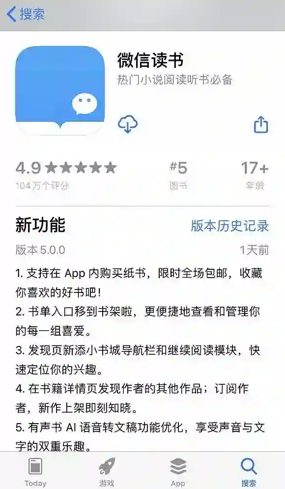 【微信读书新版本上线,支持app内购买纸质书】8月28日消息,微信读书5.0.0版本上线,新增支持app内购买纸质书,有声书AI语音转文稿优化,在书籍详情页发现作者其他作品等功能。