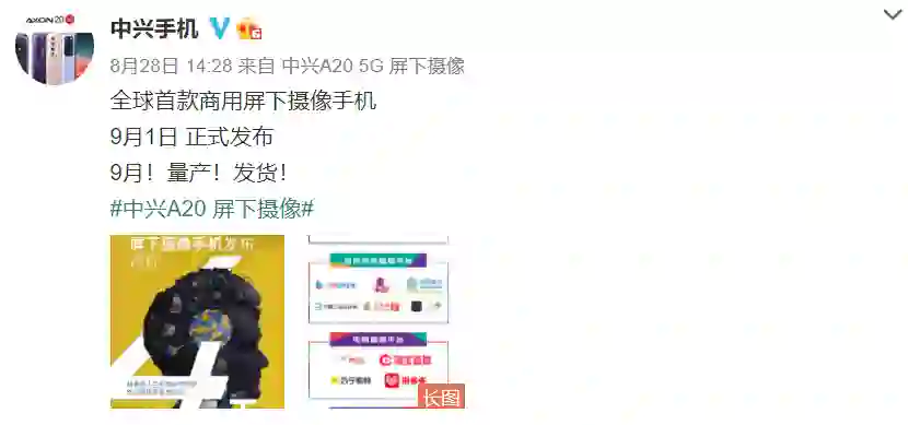 【中兴手机:全球首款商用屏下摄像手机将于9月1日正式发布】8月28日消息,中兴手机宣布其全球首款商用屏下摄像手机AXON 20 5G将于9月1日正式发布,并且9月即可量产发货。