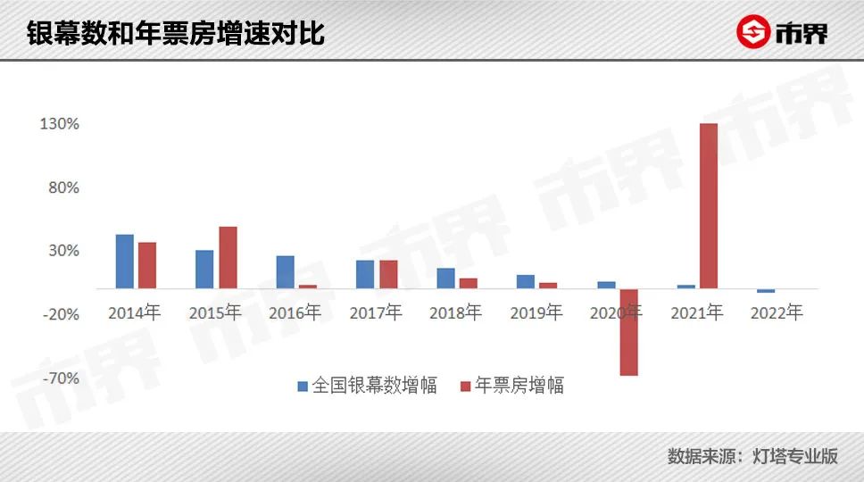 这一点从银幕数增速超过票房增速也能看出一二。根据灯塔专业版数据,2014年-2019年间,只有2015年的票房增速超过了银幕数增速。此外,2021年的银幕数是2013年的4倍多,但票房却只有2倍多。