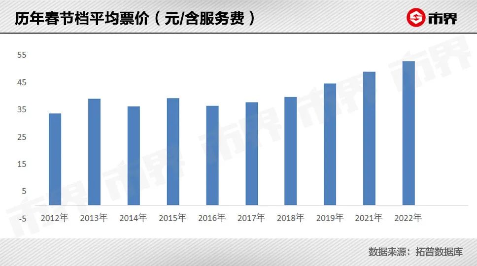 若从整体春节档来看,平均票价已经从2012年的33.7元,上涨到了2022年的52.77元,涨幅达到了56.59%。