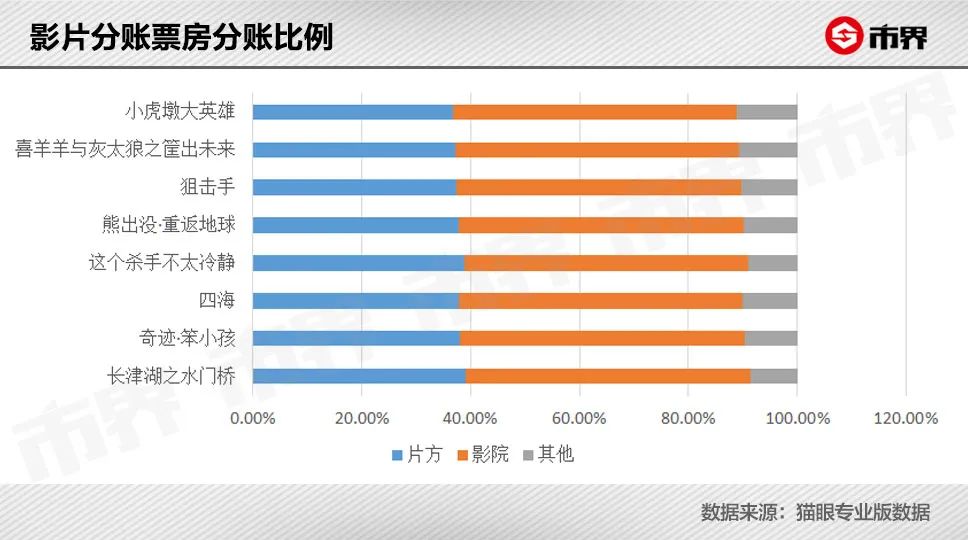 发行方一般能分到5%-8%,既包括华谊、万达、博纳等传统发行方,也包括阿里影业、猫眼电影等互联网发行方。