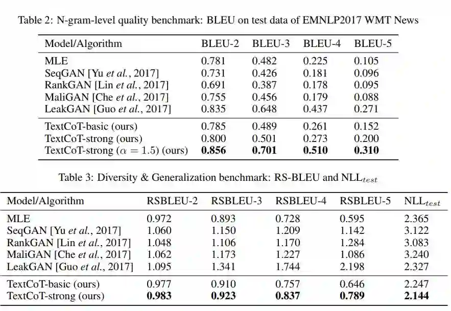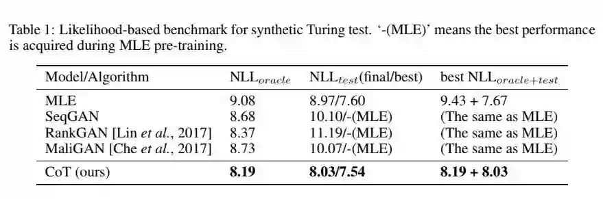 注意到,即使是在反映预测式任务性能的NLL test(这本身是MLE的优化目标)这一指标上,CoT也超越了MLE,不仅仅是在收敛性能上优于MLE,即使训练途中所探索到的最好局部最优(7.54)也好于MLE。而在生成质量的测试指标NLL oracle方面,从零开始训练,无需任何MLE预热的CoT达到了使用简单生成器架构模型中最优水平。如果综合考察生成质量和预测准确性,之前的模型在两个指标之和的意义下相比MLE并没有产生改进。而CoT不但有明显改进,而且在两个任务下的性能水平基本一致(均为8.1左右)。反观MLE,则很不均衡(生成损失:9.43预测损失:7.67)。这更说明一个无偏的优化目标对于数据建模的有效性之重要。