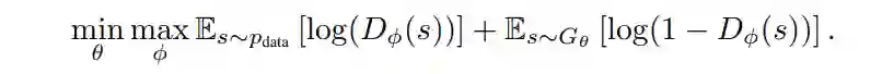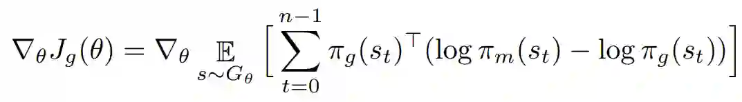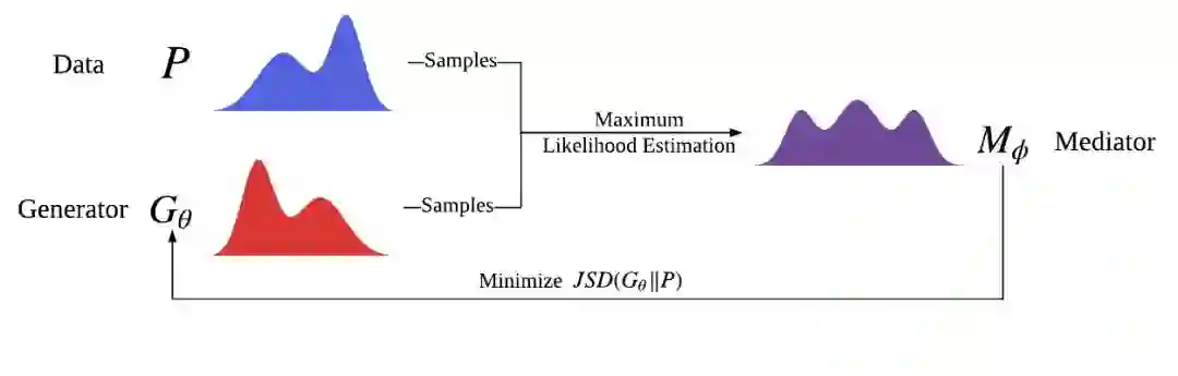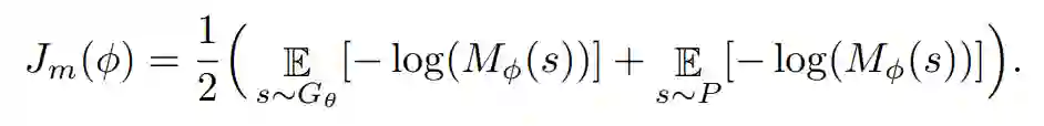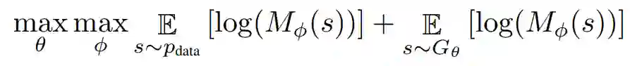 每一次迭代,从G中采出一些样本,再从训练数据中随机选出等量的样本,把两者混合,用来训练M。由于这种情况下,我们只关心M对于给定样本的似然度估计,因此在训练M时,我们使用MLE就不会产生一般意义下的各种问题。在M得到训练后,对于来自G的一组样本s,用M给出的估计值M(s)来代替真实值M*(s),从而得到一个JSD的近似估计。在训练G时,最小化这个近似估计,即可达到对于目标分布的趋近。