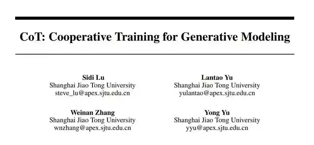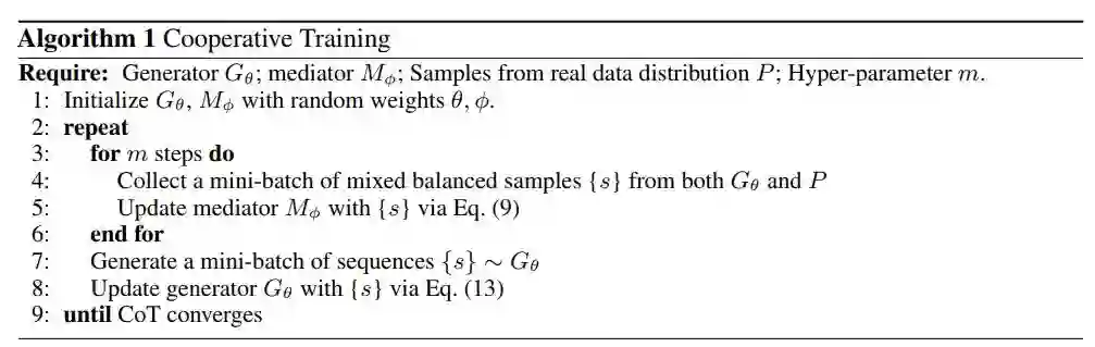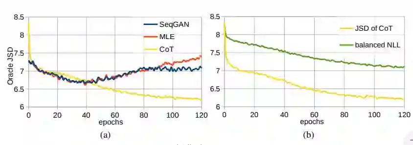 我们提出新的生成式模型训练算法合作训练(Cooperative Training),用于优化当前已习得分布和目标分布的JS散度。该算法无需预训练,计算速度和MLE同等理想,且在所有离散序列建模任务(包括生成式和预测式)里面超越了以往的算法。我们希望能进一步地对这一算法展开研究,并将其延拓至其他类型数据如图片上,为生成式模型建立一个新的范式。我们也期待研究者能够就CoT与GAN之间更深层次的联系展开研究,并产生一些有趣的结论。