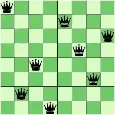 科班出身的信息相关专业的朋友看到这里就会觉得比较亲切了,经典的算法有很多,比如“冒泡排序”算法,这几乎是所有以高级语言为依托的《数据结构》的入门必学;再比如“八皇后问题”算法,这几乎也是我们在讲穷举计算时的经典保留算法案例(就是在国际象棋棋盘上放八个能够横竖斜无限制前进的皇后,让它们之间互相还不能攻击,看有多少种解);还有不少我们听说过的算法,比如MD5算法,ZIP2压缩算法等各种不胜枚举的算法。下图就是八皇后问题的一组解,我们经过穷举是可以求出所有92组解的。