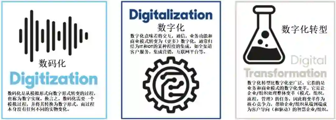 下面图2中数码化的定义由高德纳的定义【3】翻译而来。高德纳关于数字化的定义与数字化转型的定义很相近,因此本文采用了类似【4】的定义。