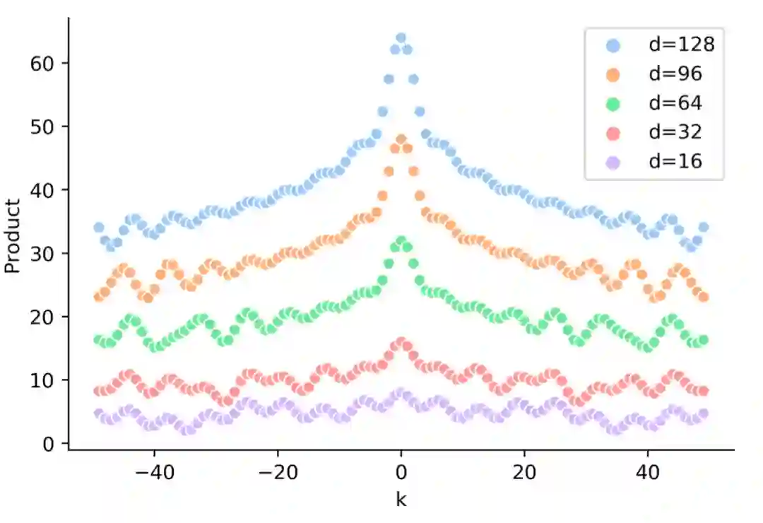 因此,对于给定的位置 pos 和 偏移量 k 而言,只取决于偏移量 k,内积会随着相对位置的递增而减小。因此两者的点积可以反映相对距离 k。如图3所示,点积的结果是对称的,并且随 |k| 增加而减少(但并不单调)。