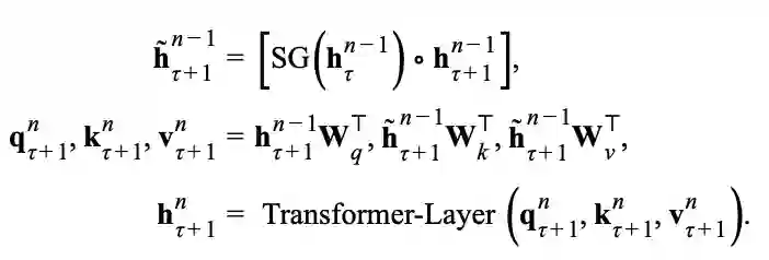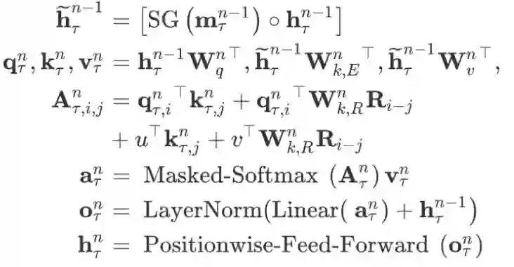 结合上述两种机制,就得到了 Transformer-XL 的体系结构。对于一个单注意力头的 N 层 Transformer-XL 而言,对于:
